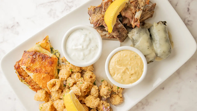 Gluten free. Grilled riblets, calamari, dolmades, spanakopita, pita, tzatziki, humus.