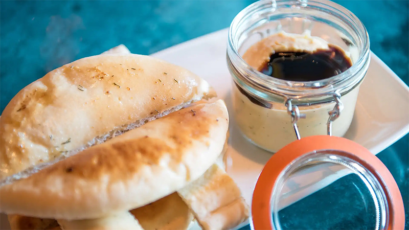 Garbanzo beans, tahini, fresh garlic, extra virgin olive oil, balsamic reduction drizzle.