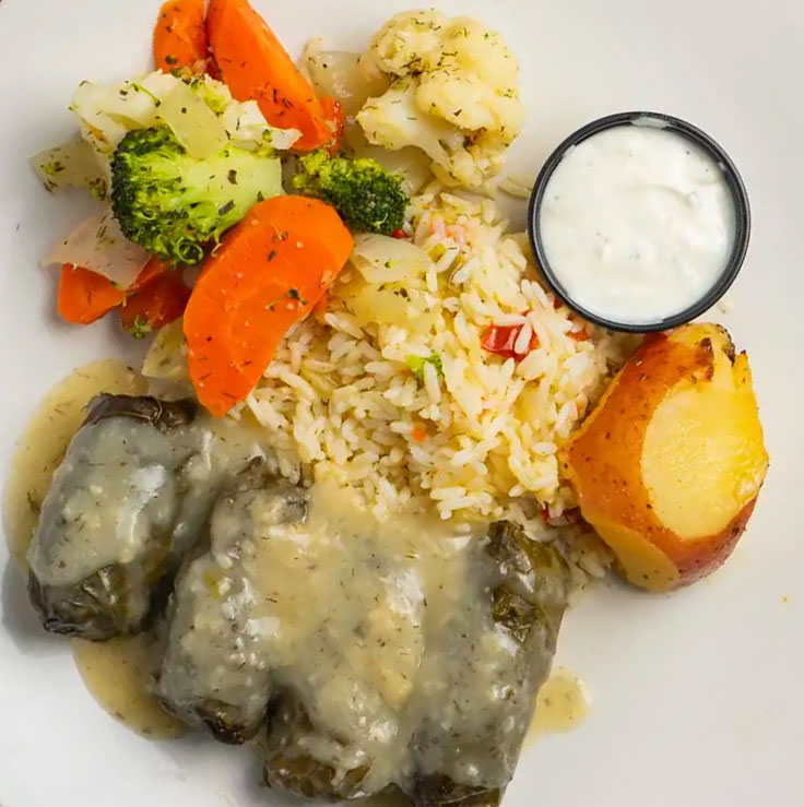 Hand-wrapped grape leaves with tender ground beef, rice, fresh herbs, homemade lemon-dill sauce.