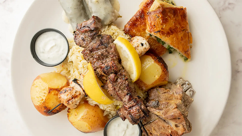 Lamb souvlaki, chicken souvlaki, spanakopita, roast lamb, dolmades, rice, roasted potatoes, greek salad, pita, tzatziki finished with a piece of homemade bougatsa.