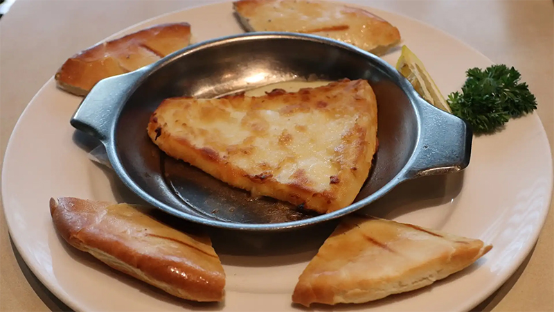Imported sharp greek sheep cheese (kefalograviera). pan-fried with egg crust, brandy flambé.