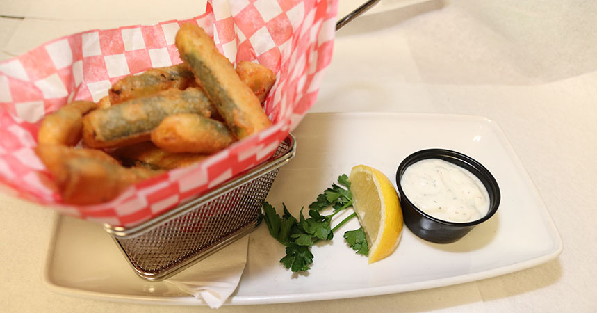 Lightly battered kolokithia (zucchini), fried and accompanied with tzatziki dipping sauce.